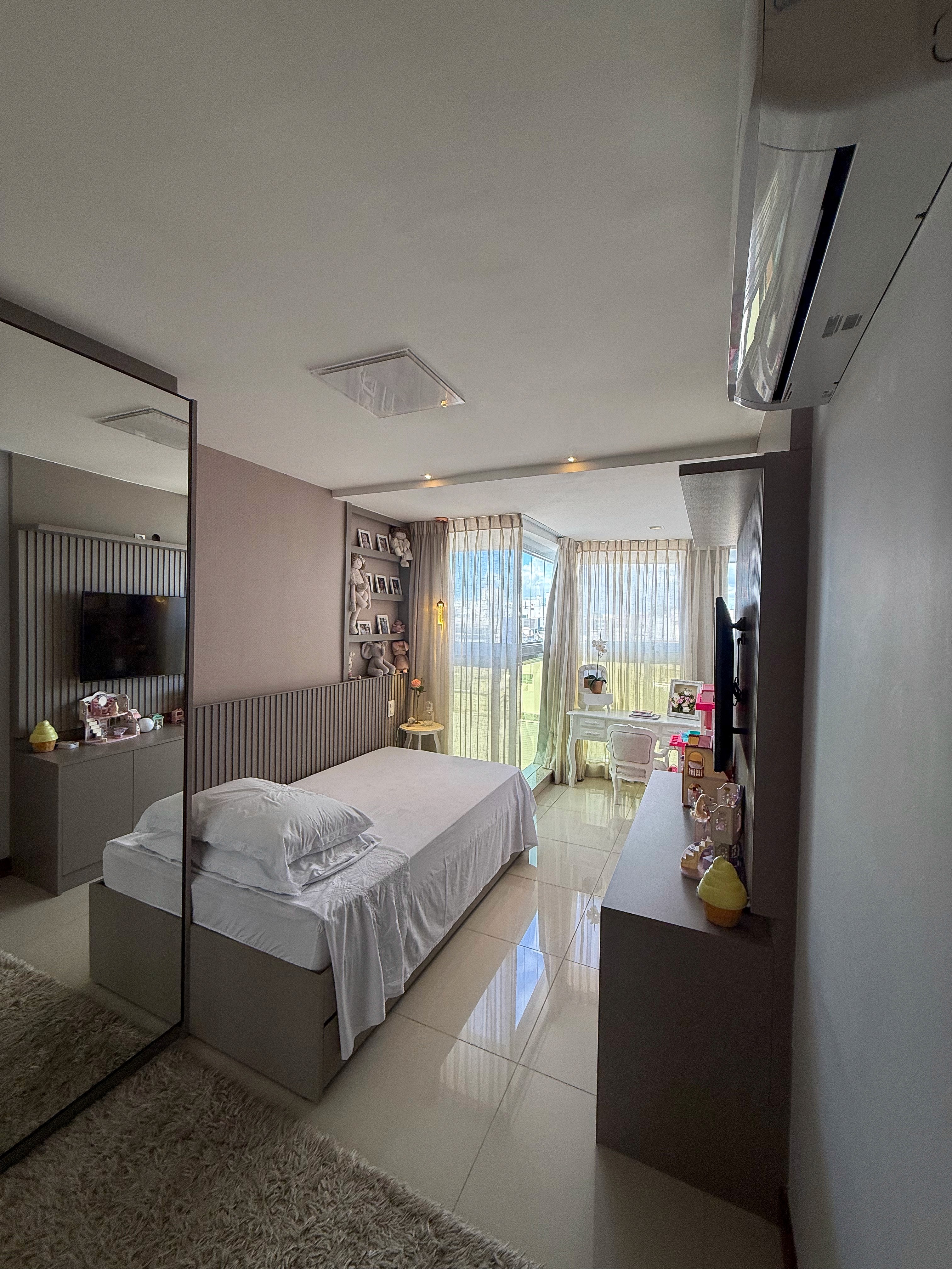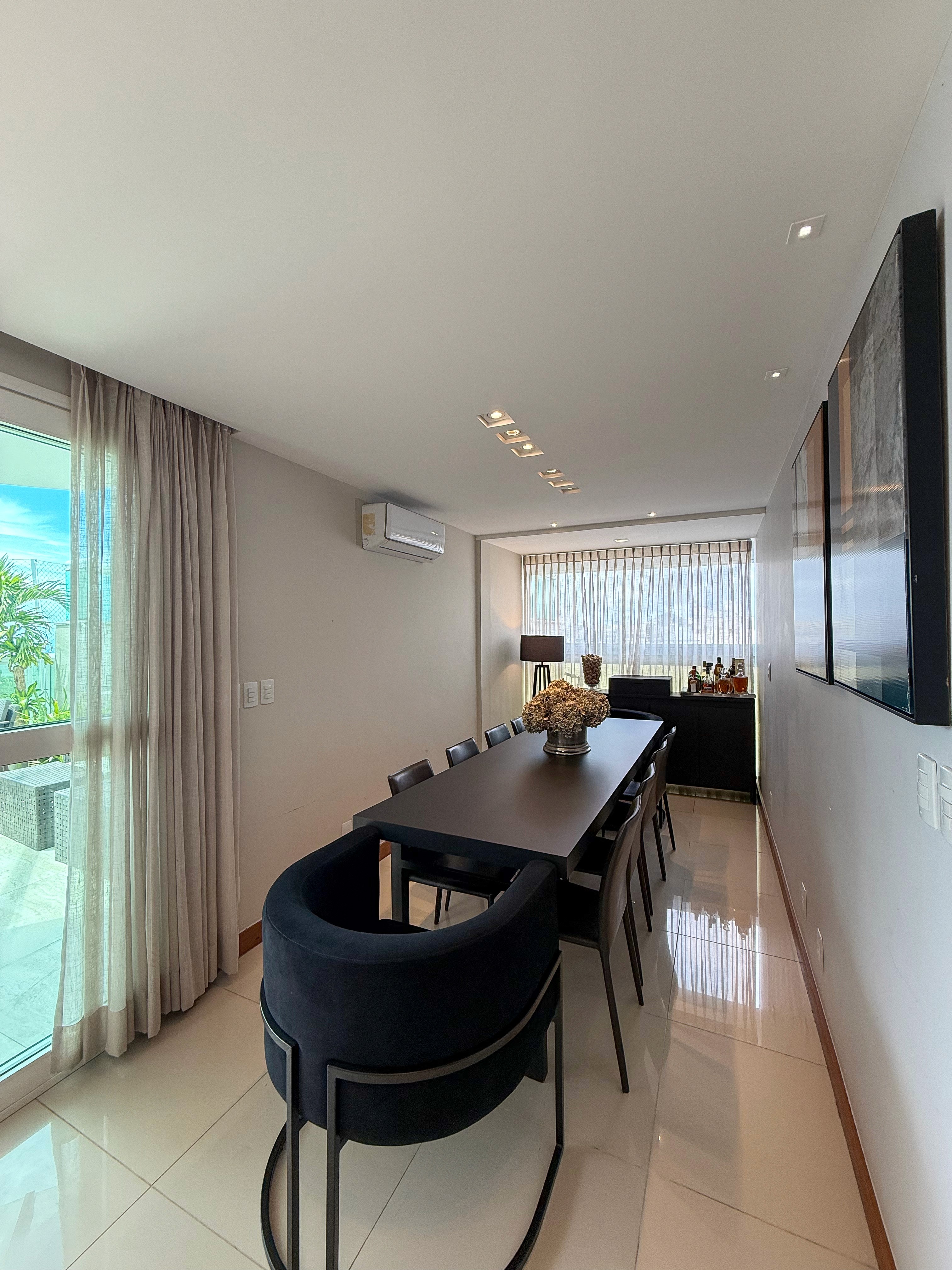 A suíte master com closet reforça a sensação de exclusividade, enquanto a marcenaria planejada, a climatização completa e o projeto de iluminação valorizam cada ambiente com elegância e funcionalidade.